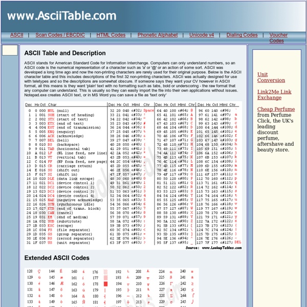 ascii may refer to any of the following:. Use the above ascii and binary codes of alphabets chart for reference and find the equivalent values between characters, ascii code and binary codes. ascii table the ascii code is used to give to each symbol / key from the keyboard a unique number called ascii code. The extended ascii codes (character code 128255) there are several different variations of the 8bit ascii table. The table below is according to iso 88591, also called iso latin1. In the ascii table we can convert hex into readable commands like if you take 4e 45 45 54 53 in hex it spells neets in ascii. Begin by using the ~d character followed by the decimal value for the function ( ascii chart) that you want to encode. decimal to ascii is a decimal to text converter. In the second column the decimal code. ascii was originally designed for use with teletypes, and so the descriptions are somewhat obscure and their use is frequently not as intended. Below is the ascii character table, including descriptions of the first 32 characters. The extended ascii character set also consists of 128 decimal numbers and ranges from 128 through 255 representing additional special, mathematical, graphic, and foreign characters. Convert the decimal numbers 87, 11, 77 and 33 to.